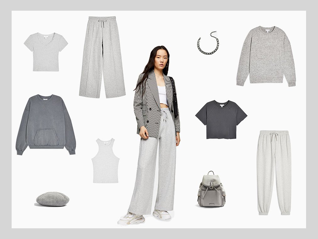 Grey is anything but boring right now: think acid-wash jersey, joggers in cool new silhouettes and cropped tops that go with virtually anything. We’re especially loving it as a total grey look made up of several different shades.